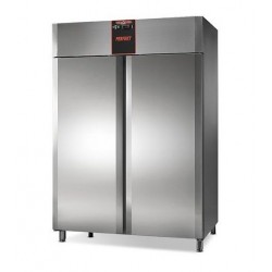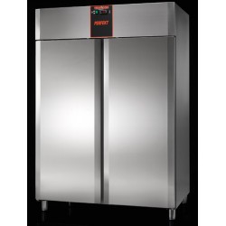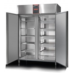Frigorifero 1400 lt. Interno ed esterno in Acciaio Inossidabile, eccetto fondo, soffitto e schienale esterni in Acciaio Galvanizzato. Angoli interni arrotondati. Isolamento in poliuretano senza CFC, iniettato ad alta pressione. Spessore dell’isolamento: 60 mm. Porte a chiusura automatica con guarnizione magnetica. Pannello di controllo elettronico frontale con sonda NTC. Refrigerazione ventilata. Unità refrigerante a monoblocco estraibile e tropicalizzata di serie (temperatura ambiente +43°C ed umidità relativa del 65%) funzionante con gas R452A. Armadi disponibili anche nella versione senza unità refrigerante. Sbrinamento ed evaporazione dell’acqua di condensa completamente automatici. Piedi in Acciaio Inossidabile regolabili in altezza.