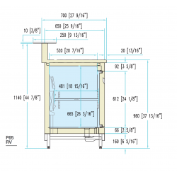 - Cella in struttura monolitica isolata con poliuretano ecologico espanso a CO2 densità 40 Kg/mc, realizzata internamente in acciaio INOX AISI304 18/10 finitura 2B ed esternamente, nella parete frontale, in finitura BA (lucida) che è realizzata in un unico elemento privo di giunzioni e con apertura per ante di dimensioni commerciali (604x444), montate a filo esterno parete senza cornice perimetrale a rilievo. Le pareti esterne sono realizzate in lamiera elettrozincata e verniciata in colore grigio RAL 9006 mentre la parete esterna posteriore e il fondo esterno sono realizzati in lamiera elettrozincata.