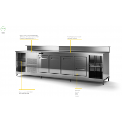 Quando presenti, i lavelli sono dotati di miscelatore a leva e relative tubazioni oltre alla piletta, sifone e relativa raccorderia. Sono disponibili numerosi optional a richiesta, tra cui canotto/i bottigliera, presa elettrica monofase e trifase industriale, presa elettrica Trifase 220V, rialzi per macchia caffè con cassetto cassa, e cassetto fondi.