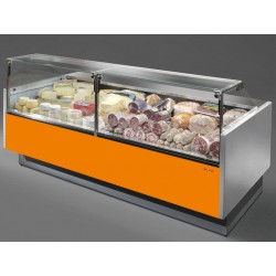 Il banco espositivo MR 80 e MR 9.5 con riserva refrigerata a sportelli, canalizzabile e dotato di vetri temperati ( curvi e dritti ) è adatto ad esporre gastronomia, carne, salumi e lattici, carne preconfezionata e snack.