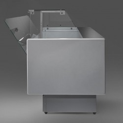 Il banco espositivo MR 80 e MR 9.5 con riserva refrigerata a sportelli, canalizzabile e dotato di vetri temperati ( curvi e dritti ) è adatto ad esporre gastronomia, carne, salumi e lattici, carne preconfezionata e snack.
