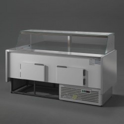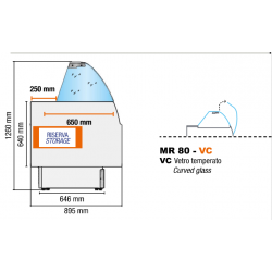 Il banco espositivo MR 80 e MR 9.5 con riserva refrigerata a sportelli, canalizzabile e dotato di vetri temperati ( curvi e dritti ) è adatto ad esporre gastronomia, carne, salumi e lattici, carne preconfezionata e snack.