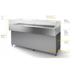 Nella versione freddo freddo-caldo il piano espositivo viene realizzato in ceramica antigraffio stratificata con vetro riscaldate. Il piano è removibile per l’accesso alla pulizia tramite una comoda maniglia in acciaio inox. Per facilitare la rimozione il piano è suddiviso in due parti. L’altezza dei piani è regolabile in 3 posizioni passo 20 mm e all’occorrenza possono essere inclinati. La regolazione avviene tramite uno specifico supporto che può essere spostato senza l’utilizzo di utensili. La temperatura di esercizio sui piani riscaldati è regolabile tramite centralina elettronica fino ad un massimo di 80°C. Premendo l’apposito tasto sulla centralina elettronica è possibile passare alla modalità freddo ventilato e viceversa. La temperatura di esercizio nella modalità freddo è +4°C/+8°C in classe climatica 3 (25°C / 60%UR). Refrigerazione ventilata con evaporatore alettato e valvola di espansione, sbrinamento automatico a tempo per fermata compressore. L’impianto di refrigerazione a bordo utilizza refrigerante naturale R290, motore ermetico ad alta efficienza e ventilatore elettronico di condensazione a basso consumo. Per la configurazione unità condensatrice remota il refrigerante utilizzato è R404A / R452A. Ogni banco è dotato di centralina elettronica per il controllo di temperatura e luci. La centralina è incorporata nell’ingombro della struttura coibentata a sx (vista lato operatore) mentre sul fronte è presente un ripetitore di temperatura.