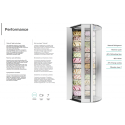 Lo sbrinamento automatico ad inversione di ciclo permette tempi inferiori del 50%, rispetto al gas caldo, in modo da mantenere intatta la qualità della superfcie del gelato, riducendo altresì i consumi energetici. La refrigerazione, ventilata con singola mandata d'aria anteriore, è delicata e omogenea. I ventilatori elettronici del condensatore, ad alta efficienza, permettono un notevole risparmio energetico.