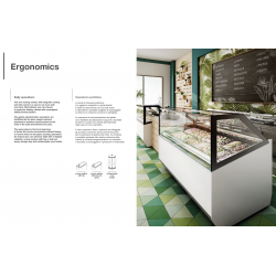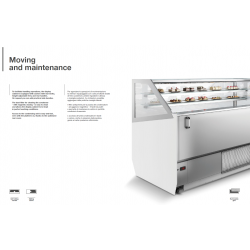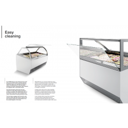 Le operazioni di somministrazione del gelato sono facilitate dai distanziali di supporto vaschette (di serie in acciaio inox) inseriti alle estremità della vasca e tra le vaschette. Il vetro superiore è fisso e spazioso per alloggiare gli accessori di servizio senza doverli rimuovere per le operazioni di apertura del vetro. Su richiesta è possibile applicare (lato destro posteriore della vetrina) la consolle lavaporzionatore con rubinetto o doccetta, il portaoggetti e il portaconi in metacrilato.