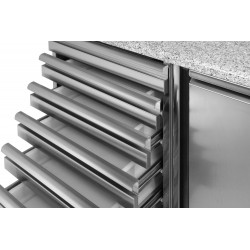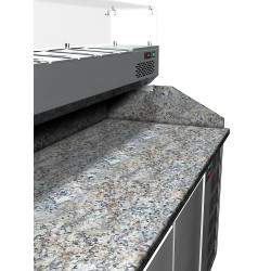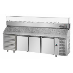 Banco pizza. Interno ed esterno in Acciaio Inossidabile, con esclusione del fondo esterno in Acciaio Galvanizzato. Angoli interni arrotondati. Isolamento in poliuretano senza CFC, iniettato ad alta pressione. Spessore dell’isolamento: 40 mm. Porte a chiusura automatica con guarnizione magnetica. Pannello di controllo elettronico frontale con sonda NTC. Refrigerazione ventilata. Unità refrigerante a monoblocco estraibile e tropicalizzata di serie (temperatura ambiente +43°C ed umidità relativa del 65%) funzionante con gas R404A/R507. Sbrinamento ed evaporazione dell’acqua di condensa completamente automatici. Piedi in Acciaio Inossidabile regolabili in altezza. Piano di lavoro in granito e sottopiano isolato. Il Tavolo Pizza è abbinabile a vetrine refrigerate con gruppo indipendente.