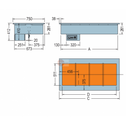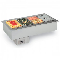 Drop in caldo bagnomaria. Struttura interamente in acciaio inox aisi 304. Kit supporto bacinelle incluso. Capacità bacinelle GN di varie dimensioni con altezza 150 mm. Carico acqua manuale. Temperatura +30°/+90°.