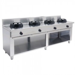 Costruzione esclusivamente su misura: dimensioni e disposizione dei fuochi decise dal cliente. Cucina speciale per ristorazione orientale con bruciatori ad alto rendimento: la fiamma verticale sviluppata riscalda uniformemente tutta la padella consentendo una cottura rapidissima e totale dei cibi. Quattro bruciatori atmosferici in ghisa con fiamma ad espansione verticale (C KW 9,5) . Bruciatori smontabili per una facile pulizia e manutenzione. Struttura interamente realizzata in acciaio inox AISI 304 18/10. Piano di cottura in acciaio inox AISI 304 18/10 spessore mm. 2,5 rinforzato: liscio. Versione da muro. Padella raccogli-gocce estraibile sotto i bruciatori. Cerchi di appoggio wok (CERCHIO/CC) o griglie tonde (GRIGLIA/CC) realizzati in ghisa smaltata nera lucida porcellanata. Piedini regolabili inox AISI 304 18/10. Certificazione di conformità CE.