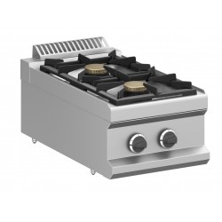 Cucina a gas. La gamma di cucine a gas PIANETACHEF si compone di modelli 2/4/6 fuochi disponibili nella versione monoblocco su armadio aperto, su forno (gas statico o elettrico ventilato) o nella versione top. Bruciatori estraibili in ghisa smaltata, da 7 kW o 5,5 kW. I forni comprendono reggigriglie 3 livelli e 1 griglia inclusa. Forni elettrici dotati di 2 resistenze separate, una sul cielo (grill) e una sul fondo.