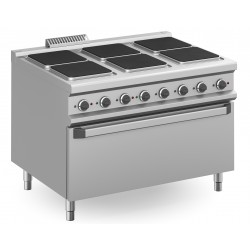 La gamma di cucine a gas PIANETACHEF si compone di modelli 2/4/6 fuochi disponibili nella versione monoblocco su armadio aperto, su forno statico a gas o elettrico e su forno gas maxi. Bruciatori estraibili in ghisa smaltata, da 5,5 kW, 7 kW e 11 kW. I forni comprendono reggigriglie 3 livelli e 1 griglia inclusa. Forni elettrici dotati di 2 resistenze separate, una sul cielo (grill) e una sul fondo.