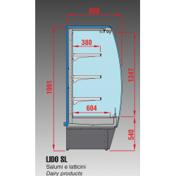 • Versione Salumi e Latticini (SL): 3 ripiani in lamiera verniciata bianca atossica oppure in acciaio inox (per versione inox), regolabili in altezza, dotati di portaprezzo;