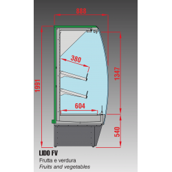 • Versioni Frutta e Verdura (FV): 2 ripiani inclinati in lamiera verniciata bianca atossica oppure in acciaio inox (per versione inox) dotati di portaprezzo, e specchio superiore inclinato;