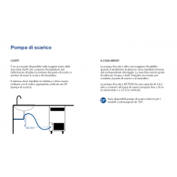 È un accessorio disponibile nella maggior parte delle macchine R290 che consente l’installazione del fabbricatore di ghiaccio lontano dal punto di scarico e persino di usare lo scarico del lavandino. Il sistema viene installato in fabbrica e deve essere ordinato con il codice appropriato, indicato da DP (pompa di scarico).