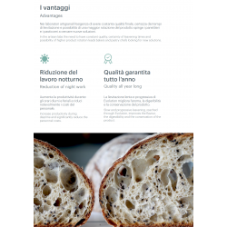 - Cicli automatici di fermalievitazione (composti dalle fasi di blocco, conservazione, risveglio, lievitazione e ritardo informamento) e cicli manuali di conservazione e di lievitazione (con gestione della temperatura e dell’umidità), Allarmi HACCP