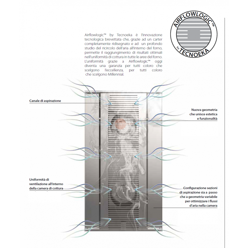 Airflowlogic™ by Tecnoeka è l’innovazione tecnologica brevettata che, grazie ad un carter completamente ridisegnato e ad un profondo studio del ricircolo dell’aria all’interno del forno, permette il raggiungimento di risultati ottimali nell’uniformità di cottura in tutte le aree del forno.