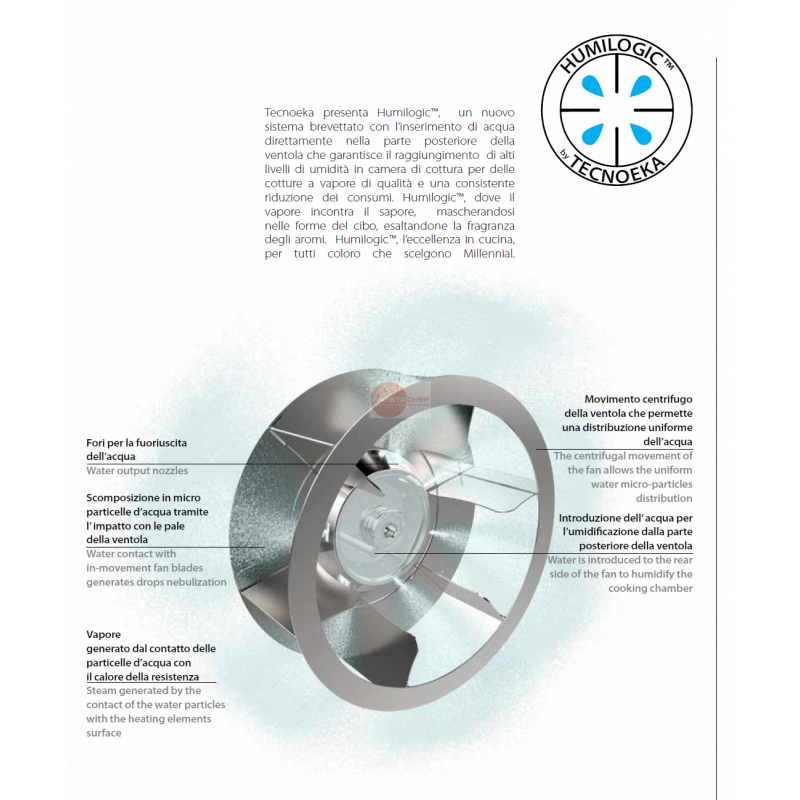 Tecnoeka presenta Humilogic™, un nuovo sistema brevettato con l’inserimento di acqua direttamente nella parte posteriore della ventola che garantisce il raggiungimento di alti livelli di umidità in camera di cottura per delle cotture a vapore di qualità e una consistente riduzione dei consumi. Humilogic™, dove il vapore incontra il sapore, mascherandosi nelle forme del cibo, esaltandone la fragranza degli aromi.