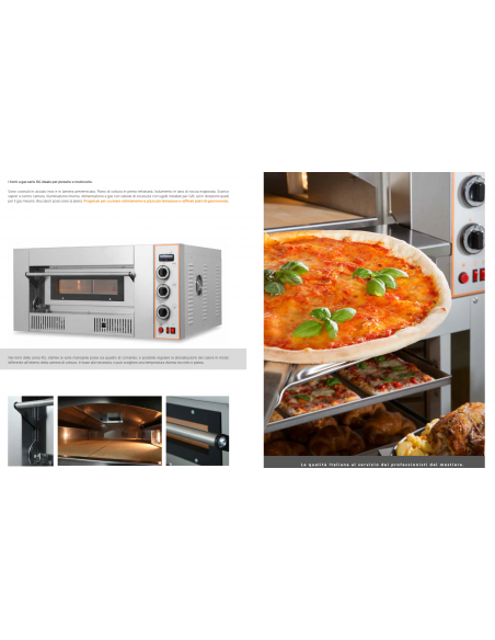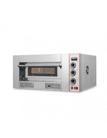 Forno elettrico con 1 camera di cottura, i comandi possono essere sia digitali che meccanici, possono cucinare da 1 a 9 pizze contemporaneamente (più o meno a seconda del diametro).