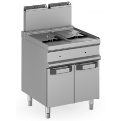 Friggitrice elettrica su armadio, facile da usare e da pulire. Possono avere 1 o 2 vasche dai 13 litri ai 18 litri, le doppie vasche vanno dai 8 + 8 litri ai 17 + 17 litri. Sono trifase.