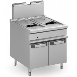 Friggitrice elettrica su armadio, facile da usare e da pulire. Possono avere 1 o 2 vasche dai 13 litri ai 18 litri, le doppie vasche vanno dai 8 + 8 litri ai 17 + 17 litri. Sono trifase.