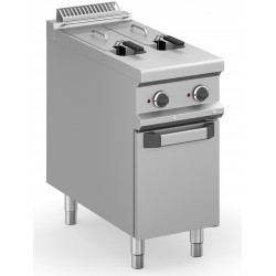 Friggitrice elettrica su armadio, facile da usare e da pulire. Possono avere 1 o 2 vasche dai 13 litri ai 18 litri, le doppie vasche vanno dai 8 + 8 litri ai 17 + 17 litri. Sono trifase.