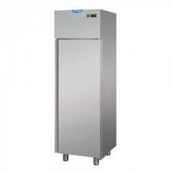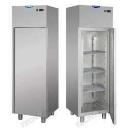 Frigorifero 400 lt. Interno ed esterno in Acciaio Inossidabile, eccetto fondo, soffitto e schienale esterni in Acciaio Galvanizzato. Angoli interni arrotondati. Isolamento in poliuretano senza CFC, iniettato ad alta pressione. Spessore dell’isolamento: 50 mm. Porte a chiusura automatica con guarnizione magnetica. Pannello di controllo elettronico frontale con sonda NTC. Refrigerazione ventilata. Unità refrigerante a monoblocco estraibile e tropicalizzata di serie (temperatura ambiente +43°C ed umidità relativa del 65%) funzionante con gas R404A/R507. Armadi disponibili anche nella versione senza unità refrigerante. Sbrinamento ed evaporazione dell’acqua di condensa completamente automatici. Piedi in Acciaio Inossidabile regolabili in altezza.