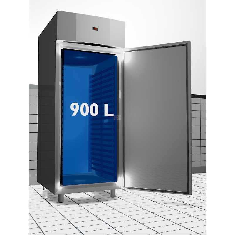 Armadio frigo 900 lt. Interno ed esterno in Acciaio Inossidabile, eccetto fondo, soffitto e schienale esterni in Acciaio Galvanizzato. Angoli interni arrotondati. Isolamento in poliuretano senza CFC, iniettato ad alta pressione. Spessore dell’isolamento: 60 mm. Porte a chiusura automatica con guarnizione magnetica. Dispositivo fermo ventilazione all'apertura porta. Pannello di controllo elettronico frontale con 2 sonda NTC. Resistenza all'evaporatore. Refrigerazione ventilata. Unità refrigerante a monoblocco estraibile e tropicalizzata di serie (temperatura ambiente +43°C ed umidità relativa del 65%) funzionante con gas R404A/R507. Armadi disponibili anche nella versione senza unità refrigerante. Sbrinamento ed evaporazione dell’acqua di condensa completamente automatici. Piedi in Acciaio Inossidabile regolabili in altezza.