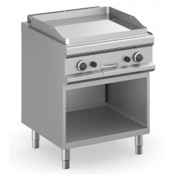 La gamma di frytop PIANETACHEF offre modelli per cotture a contatto, con piastre in acciaio satinato lisce, rigate, lisce e rigate, sia in versioni 1/2 modulo che modulo intero, con funzionamento elettrico o a gas, tutti con controllo termostatico della temperatura di lavoro. Piastra di cottura in acciaio dolce liscia o rigata con finitura levigata.
