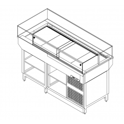 Nella versione freddo freddo-caldo il piano espositivo viene realizzato in ceramica antigraffio stratificata con vetro riscaldate. Il piano è removibile per l’accesso alla pulizia tramite una comoda maniglia in acciaio inox. Per facilitare la rimozione il piano è suddiviso in due parti. L’altezza dei piani è regolabile in 3 posizioni passo 20 mm e all’occorrenza possono essere inclinati. La regolazione avviene tramite uno specifico supporto che può essere spostato senza l’utilizzo di utensili. La temperatura di esercizio sui piani riscaldati è regolabile tramite centralina elettronica fino ad un massimo di 80°C. Premendo l’apposito tasto sulla centralina elettronica è possibile passare alla modalità freddo ventilato e viceversa. La temperatura di esercizio nella modalità freddo è +4°C/+8°C in classe climatica 3 (25°C / 60%UR). Refrigerazione ventilata con evaporatore alettato e valvola di espansione, sbrinamento automatico a tempo per fermata compressore. L’impianto di refrigerazione a bordo utilizza refrigerante naturale R290, motore ermetico ad alta efficienza e ventilatore elettronico di condensazione a basso consumo. Per la configurazione unità condensatrice remota il refrigerante utilizzato è R404A / R452A. Ogni banco è dotato di centralina elettronica per il controllo di temperatura e luci. La centralina è incorporata nell’ingombro della struttura coibentata a sx (vista lato operatore) mentre sul fronte è presente un ripetitore di temperatura.
