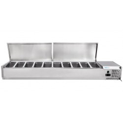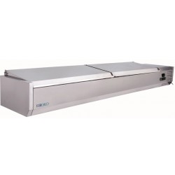 Vetrine refrigerate pizza con refrigerazione statica. Coperchio di protezione per una migliore conservazione del cibo. Gruppo incorporato solo lato destro. gas R600a. Adatte per il contenimento di bacinelle gastronorm inox o policarbonato ( bacinelle escluse).