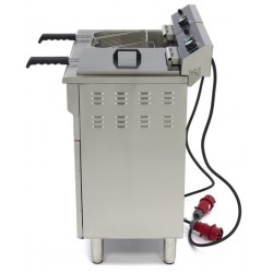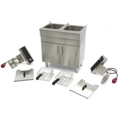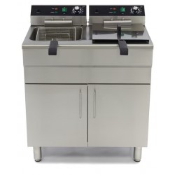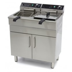 Per un uso intensivo nella cucina professionale, questa friggitrice doppia con rubinetto di scarico e armadietto è molto adatta. Nelle due vasche da 16 litri ciascuna, è possibile friggere grandi quantità di cibo come patatine, snack, pesce e verdure. La base è dotata di sportelli in acciaio inox e sotto ogni vasca è installato un rubinetto di scarico. Grazie a questi rubinetti, cambiare l'olio vecchio diventa un lavoro molto più semplice. L'armadietto può essere utilizzato anche come spazio per riporre l'olio extra, ad esempio. La friggitrice è dotata di due coperchi rimovibili e di due cestelli per la frittura. Entrambe le parti sono dotate di maniglie resistenti al calore per un utilizzo sicuro. Inoltre, la protezione da sovraccarico assicura che i cestelli di frittura non possano essere sovraccaricati di prodotti. Grazie ai piedini in gomma, la friggitrice si appoggia saldamente a qualsiasi superficie piana della cucina.