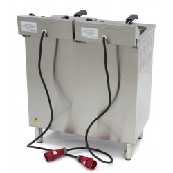 Questa friggitrice è dotata di due prese di corrente da 400V. Grazie alla zona fredda l'olio rimane fresco più a lungo, questo perché gli elementi riscaldanti si trovano appena sopra il fondo della padella. L'olio sotto gli elementi riscaldanti diventa meno caldo e le briciole hanno meno probabilità di bruciare. Di conseguenza, l'olio può essere utilizzato più a lungo. La temperatura per ogni elemento riscaldante può essere facilmente impostata con il termostato che può gestire temperature comprese tra 50°C e 200°C.