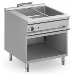 La vasca realizzata in acciaio AISI 304 18/10 è stampata e saldata al piano in modo continuo. Riscaldamento elettrico con resistenze corazzate esterne, fissate sul fondo esterno della vasca e controllo della temperatura tramite termostato. Piano di lavoro in acciaio AISI 18/10 con spessore 1 mm. Allineamento dei moduli tramite accostamento.