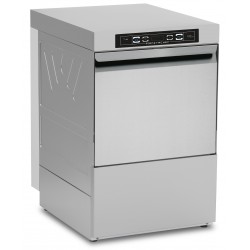 Lavabicchieri con cesto da 40x40 cm costruita in doppia parete stratificata sui fianchi con guide cesto arrotondate e imbutite e porta in doppia parete integrale. La vasca è saldata ed è dotata di filtro integrale in materiale composito. La camera di lavaggio è priva di tubazioni interne e di spigoli. La funzione di lavaggio si sviluppa con il solo braccio
