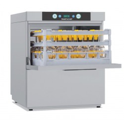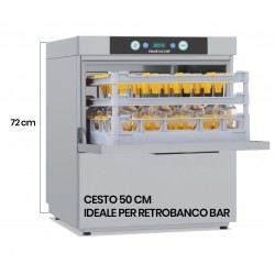 Lavabicchieri con cesto da 50x50 cm costruita in doppia parete spaziata sui fianchi con guide cesto arrotondate e imbutite e porta in doppia parete integrale controbilanciata. La vasca ha il fondo stampato ed è dotata di filtro integrale in materiale composito.