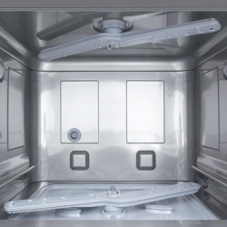 La camera di lavaggio è priva di tubazioni interne e di spigoli. Optional lo zoccolo inox con vano porta cesti. Di serie i dosatori detergente e brillantante peristaltici regolabili dal pannello comandi.