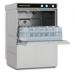 Lavabicchieri con cesto da 35x35 cm con interfaccia utente elettromeccanica costruita in doppia parete parziale sui fianchi con guide cesto arrotondate e imbutite e porta in doppia parete integrale. La vasca è saldata ed è dotata di filtro integrale in materiale composito. La camera di lavaggio è priva di tubazioni interne e di spigoli.