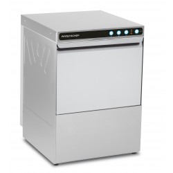 Lavastoviglie sottobanco monofase con cesto da 50x50 cm con interfaccia utente elettromeccanica costruita in doppia parete parziale sui fianchi con guide cesto arrotondate e imbutite e porta in doppia parete integrale. La vasca ha il fondo imbutito ed è dotata di filtro integrale in materiale composito.