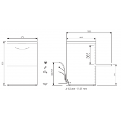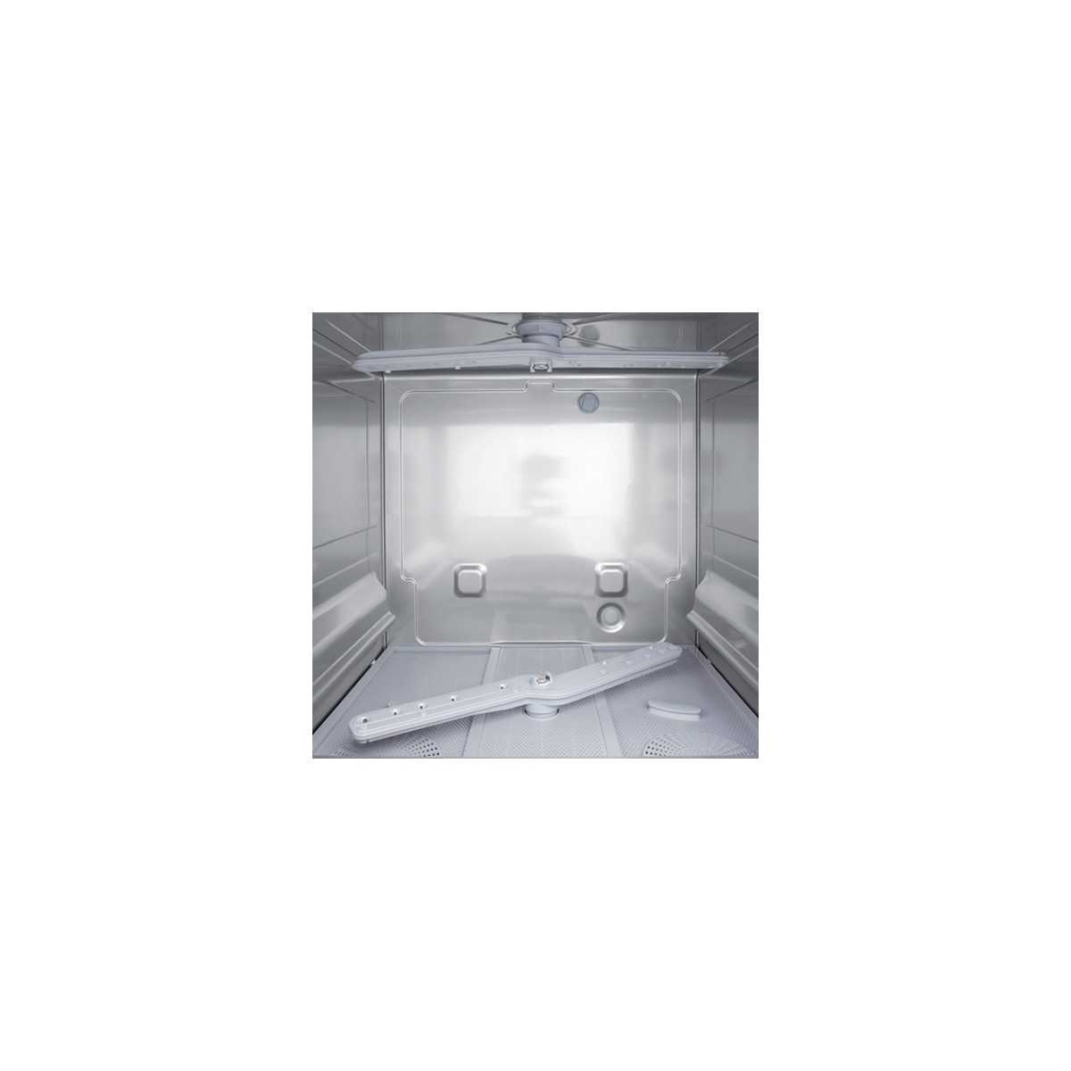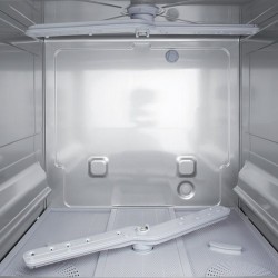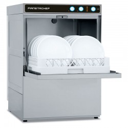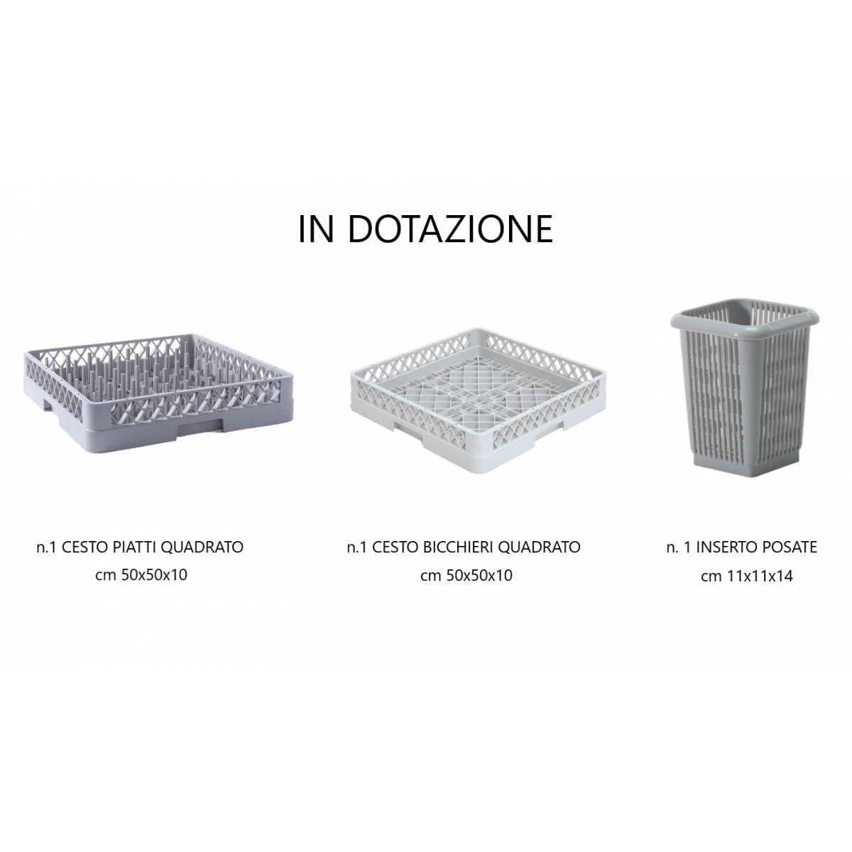 Lavastoviglie sottobanco con cesto da 50x50 cm con interfaccia utente elettromeccanica costruita in doppia parete parziale sui fanchi con guide cesto arrotondate e imbutite e porta in doppia parete integrale.
