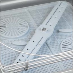 La vasca ha il fondo imbutito ed è dotata di fltro integrale in materiale composito. La camera di lavaggio è priva di tubazioni interne e spigoli. Di serie il dosatore brillantante