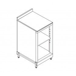 Corpo del retrobanco completamente in pannelli di lamiera inox AISI304 con finitura BA (lucida). Frontale a filo con gli altri elementi dell’arredo. Piano di fondo rinforzato e provvisto di passaggi apribili per i collegamenti idraulici. Ripiano intermedio rinforzato regolabile su più posizioni senza necessità di attrezzi. Basamento in acciaio al carbonio con strutture trasversali realizzate in tubolare completi di piedini di regolazione, mentre le barre longitudinali sono realizzate in lamiera pressopiegata elettrozincata e verniciate. Il basamento può essere allestito come accessorio a richiesta con un profilo supporto pedana.