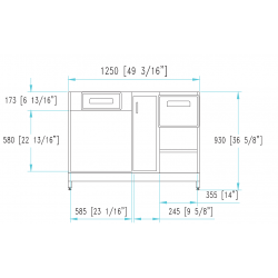 Corpo del retrobanco completamente in pannelli di lamiera inox AISI304 con finitura BA (lucida). Frontale a filo con gli altri elementi dell’arredo. Piano di fondo rinforzato e provvisto di passaggi apribili per i collegamenti idraulici. Ripiano intermedio rinforzato regolabile su più posizioni senza necessità di attrezzi. Basamento in acciaio al carbonio con strutture trasversali realizzate in tubolare completi di piedini di regolazione, mentre le barre longitudinali sono realizzate in lamiera pressopiegata elettrozincata e verniciate. Il basamento può essere allestito come accessorio a richiesta con un profilo supporto pedana.