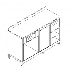 Corpo del retrobanco completamente in pannelli di lamiera inox AISI304 con finitura BA (lucida). Frontale a filo con gli altri elementi dell’arredo. Piano di fondo rinforzato e provvisto di passaggi apribili per i collegamenti idraulici. Ripiano intermedio rinforzato regolabile su più posizioni senza necessità di attrezzi. Basamento in acciaio al carbonio con strutture trasversali realizzate in tubolare completi di piedini di regolazione, mentre le barre longitudinali sono realizzate in lamiera pressopiegata elettrozincata e verniciate. Il basamento può essere allestito come accessorio a richiesta con un profilo supporto pedana.