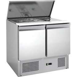 Saladette refrigerata. Saladette refrigerata per insalate. Struttura in acciaio inox AISI 304. Sbrinamento automatico. Evaporatore statico schiumato su tre lati con ventola per uniformare la temperatura. Coperchio ad apertura telescopica. Pianetto di lavoro in polietilene alimentare. Una griglia intermedia per porta. Termostato elettronico. Bacinelle escluse. N. 1 griglia GN 1/1 per porta.