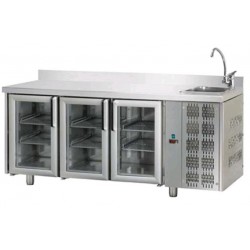 Tavolo refrigerato MID GASTRONOMIA con 3 porte vetro, temperatura normale, gruppo incorporato posizionabile a destra o sinistra.