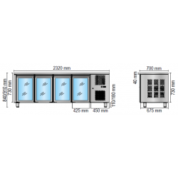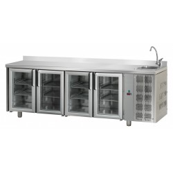 Tavolo refrigerato MID GASTRONOMIA con 4 porte vetro, temperatura normale, gruppo incorporato posizionabile a destra o sinistra.