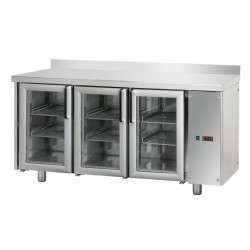 Tavolo refrigerato MID GASTRONOMIA con 3 porte vetro, temperatura normale, predisposto per unità refrigerante remota posizionabile a destra o sinistra.