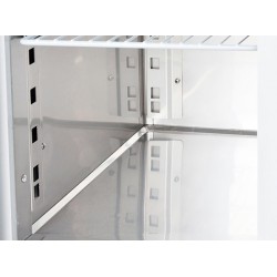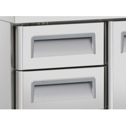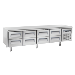 Tavolo refrigerato progettato per creare una postazione di lavoro comoda ed efficiente, che permetta di conservare gli alimenti freschi nella zona refrigerata in basso e di cuocerli con attrezzature free-standing in alto. Il modello U-GN 4180 è il connubio perfetto tra efficienza e adattabilità, con altezza 650 mm, 8 cassetti scorrevoli GN1/1 adatti a contenere vaschette da 100 mm di profondità , termostato digitale e piedini regolabili in altezza (da 120 mm a 180 mm).