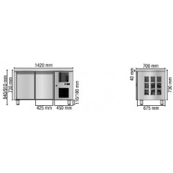 Tavolo refrigerato con refrigerazione ventilata, capienza da 282 a 620 litri, temperature positive (0 +10) e negative (-18 -22), larghezza da 128 cm a 232 cm, profondità da 70 cm a 80 cm e altezza da 85 cm a 95cm.