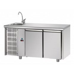 Tavolo refrigerato con lavello e refrigerazione ventilata, capienza da 310 a 620 litri temperature positive (0 +10), larghezza da 142 cm a 232cm, profondità 70 cm e altezza 120 cm.