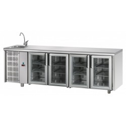 Tavolo refrigerato MID GASTRONOMIA con 4 porte vetro, temperatura normale, gruppo incorporato posizionabile a destra o sinistra.
